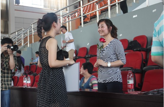 专场秀开始前,李露优子向学院创业导师、国际贸易系党总支副书记朱颖老师献上了一朵红艳如火的玫瑰。美丽的朱老师,感到又惊有喜,笑脸比红玫瑰还要动人好看……