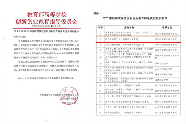 近日,教育部高等学校创新创业教育指导委员会公布了2020年度全国高职院校创新创业教育特色典型案例,我校报送的创新创业教育工作案例“四方联动筑平台 实践育人促双创”入选。此次案例评选旨在加强创新创业教育改革经验交流与分享,深化高职院校创新创业教育改革,提升职业院校人才培养质量,全国15所高职院校创新创业案例入选。这是学校创新创业教育取得的又一硕果,是对学校创新创业教育工作的高度肯定。