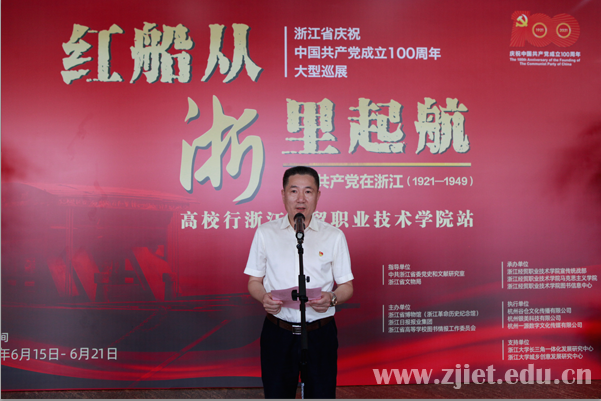 学校党委书记劳赐铭出席启动仪式并致辞。他表示,本次展览是推动学校党史学习教育走深走实的有效载体,有助于广大师生通过观展重温峥嵘岁月,理解红船精神的丰富内涵,感悟共产党人的初心使命,扛起浙江“三个地”的使命担当。他要求各二级学院组织好党员干部和师生有序积极开展参观学习,在学习中铭记初心之源,筑牢信仰之基,笃行报国之志,以高度的思想自觉和行动自觉,当好“红色根脉”的传承人、守护者,在忠实践行“八八战略”、奋力打造“重要窗口”上展示更多硬核担当,以实际行动向建党百年献礼。