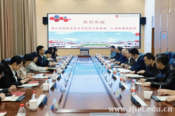 在浙江工贸职业技术学院,陈德泉一行受到浙工贸职院党委书记盖庆武,党委副书记、校长余闯,副校长汪焰的热情接待。陈德泉一行参观了办学成果展,智慧教室、国际学术报告厅、人工智能学院、光电制造学院和图书馆。座谈会上,盖庆武介绍了学校相关情况和“十四五”目标。陈德泉高度赞赏浙工贸职院在校园建设、硬件设施、内涵建设等方面取得的成果,并希望两校能加强互动、共同提高,在教育教学等各方面开展更深层次的交流。余闯、汪焰对该校专业群建设、产学合作、国际化办学、社会服务和教学能力比赛等内容进行详细介绍。双方还就专业建设等内容进行了深入交流。