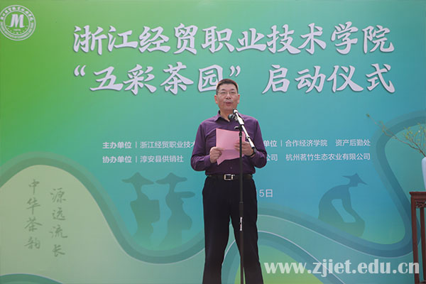 陈德泉在仪式上发表讲话。他指出,“五彩茶园”的启动,是学校传承中华文化助力茶产业发展的一件好事,是建设绿色学校的一件实事,更是推进学校高质量发展的一件喜事!他对于如何依托“五彩茶园”,加强新时代茶专业建设表达了三点希望:一是希望构建“产教融合”共同体,开辟育人主渠道;二是希望搭建“岗课赛证”育人链,培育时代新茶人 ;三是希望争做传承创新主力军,打造文化金名片。他强调,在全面推进乡村振兴战略大背景下,茶艺与茶文化专业要在大格局中紧盯目标、高点寻标、全面对标,主动顺应产业发展需求,积极创新人才培养模式,大力推进产教融合、校企合作,按下“快进键”、跑出“加速度”,让经贸“五彩茶园”、茶专业成为助力共同富裕示范区建设的一道亮丽风景。