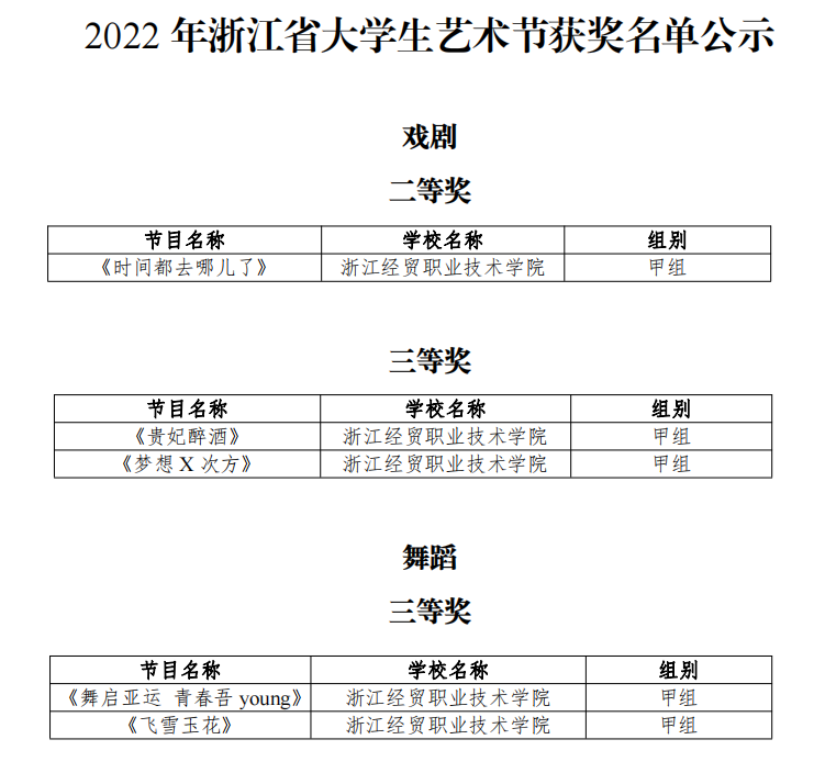 近日,由浙江省教育厅、浙江省文化和旅游厅、共青团浙江省委、浙江省财政厅、浙江广播电视集团共同主办的2022年浙江省大学生艺术节活动落下帷幕。在本届大学生艺术节中,经贸学子展现了深厚的艺术素养,取得了优异成绩。获戏剧甲组二等奖1项;舞蹈甲组三等奖2项;戏剧甲组三等奖2项,学校获优秀组织奖。