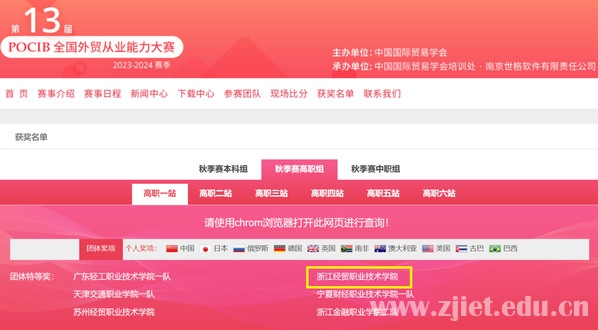 11月14日,由学校国际贸易学院10名学生组成的校代表队在第十三届POCIB全国外贸从业能力大赛(秋季赛)中再创佳绩,取得全国团体特等奖的好成绩。夏珞楠、汪乾涛等9名同学获得个人全国一等奖。