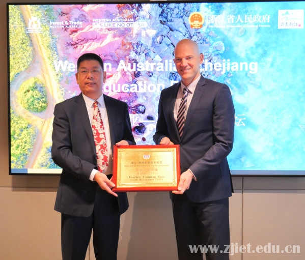 会上,陈德泉代表联盟分别与澳大利亚南部城区TAFE学院院长达尔士•加内森先生、北部城区TAFE学院院长米歇尔•霍德女士就共同建立浙江-西澳职业教育联盟师资培训基地签署合作协议并进行授牌。